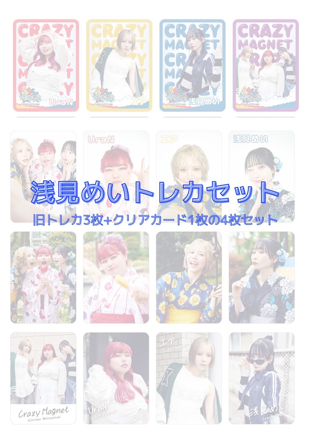 旧トレカ(浅見めいの絵柄or3人の絵柄のみ)3枚+2025年夏ツアークリアカード(浅見めいの絵柄or3人の絵柄のみ)1枚の4枚セット ※ランダムで一言メッセージ・サイン入り