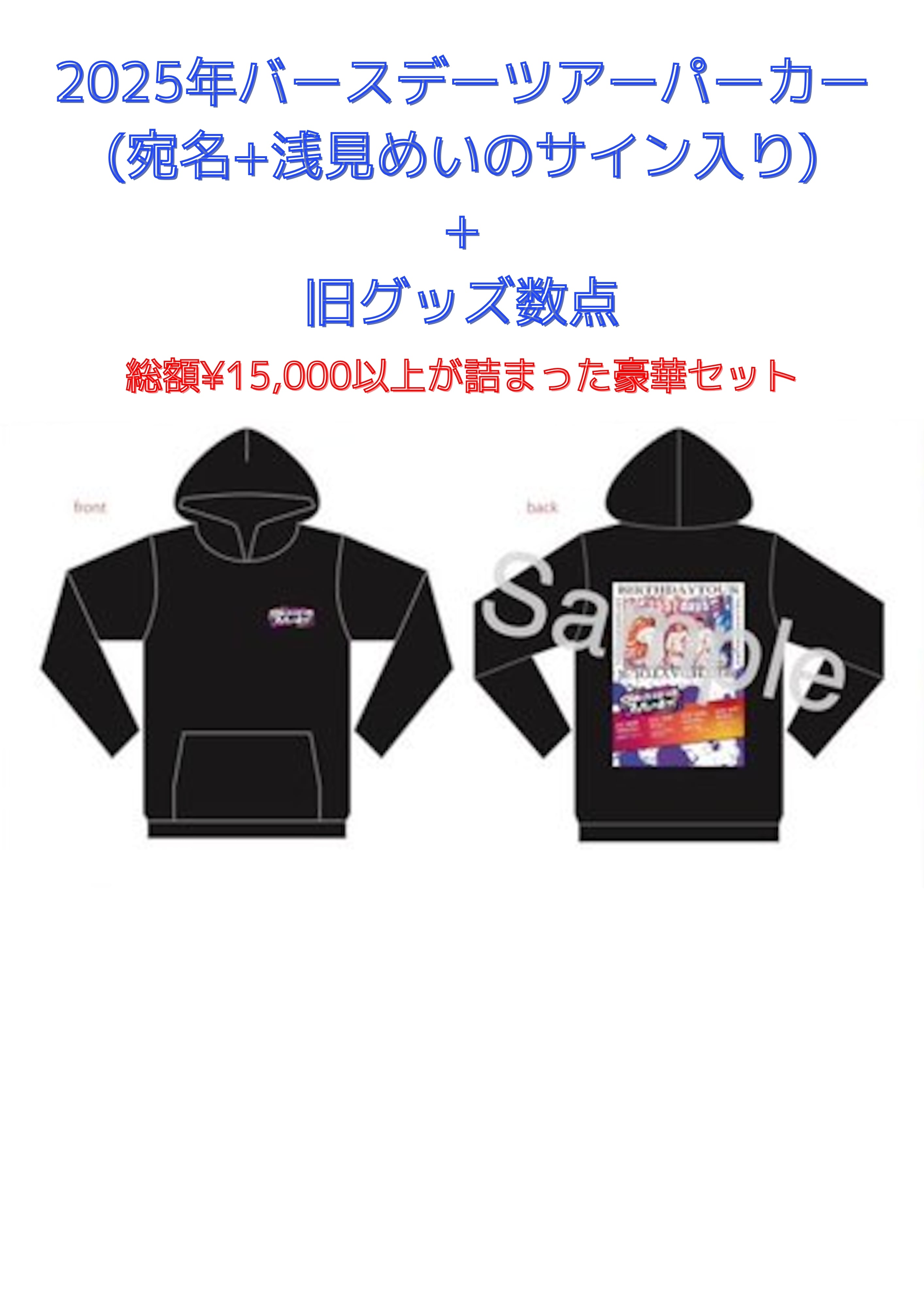 パーカー以外にランダムでグッズ2点以上含まれたセットとなります。